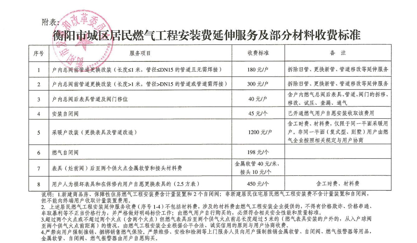 根據(jù)衡陽市發(fā)展和改革委員會(huì)《關(guān)于規(guī)范市中心城區(qū)燃?xì)夤こ贪惭b收費(fèi)有關(guān)事項(xiàng)的通知》(衡發(fā)改價(jià)商〔2024〕2號)文件規(guī)定: