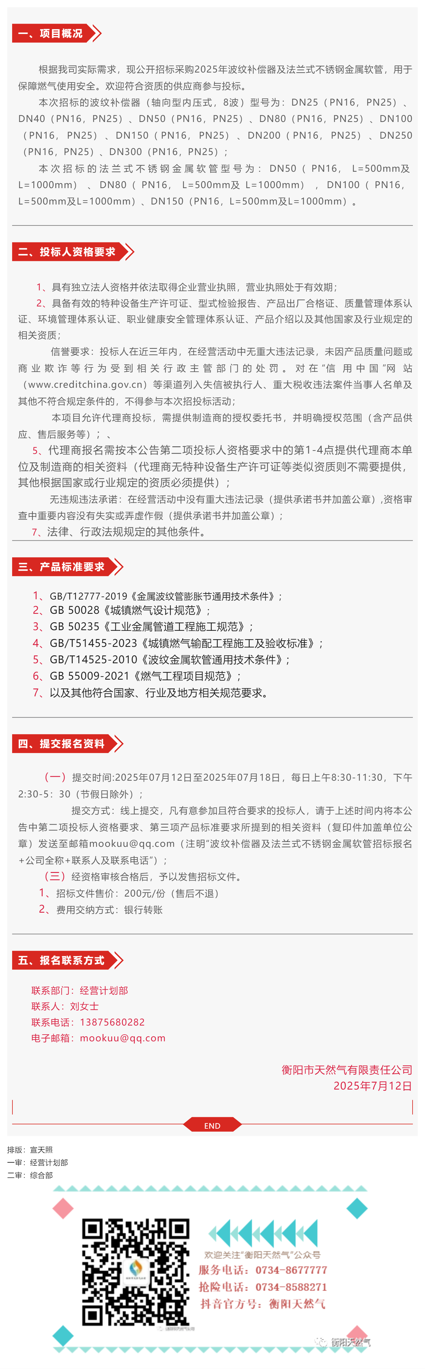 招標公告丨衡陽市天然氣有限責(zé)任公司2025年波紋補償器及法蘭式不銹鋼金屬軟管采購招標公告