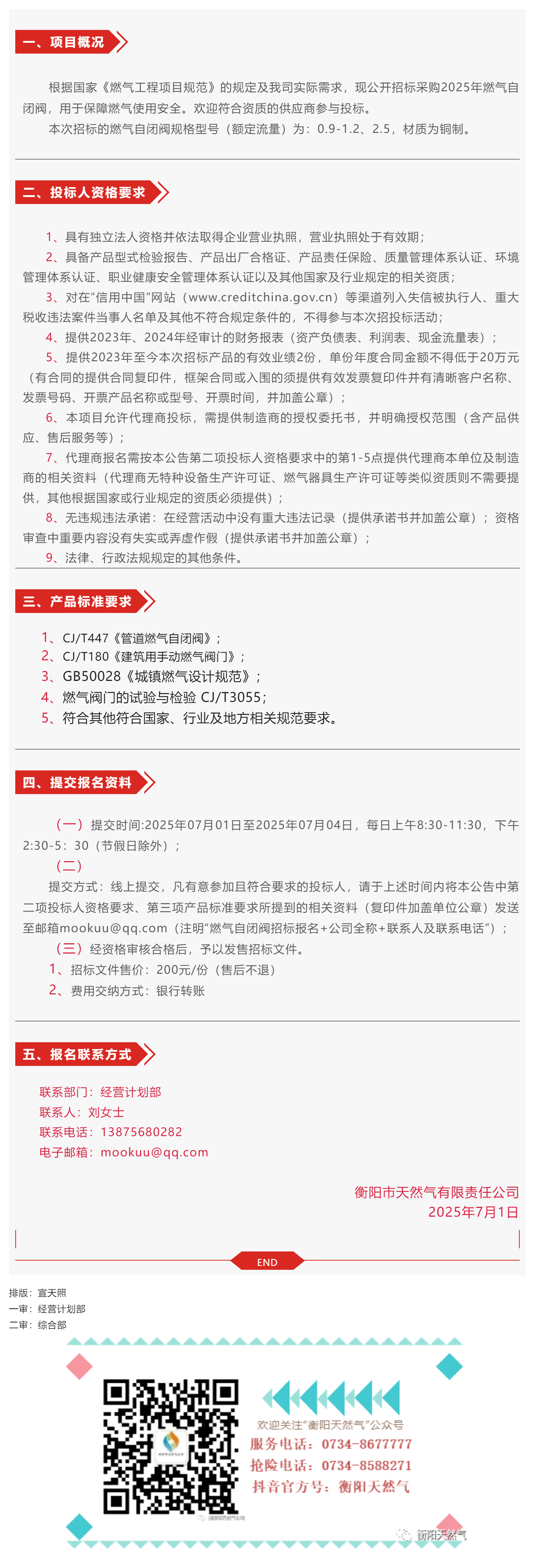 招標(biāo)公告丨衡陽市天然氣有限責(zé)任公司2025年燃?xì)庾蚤]閥采購入圍招標(biāo)公告